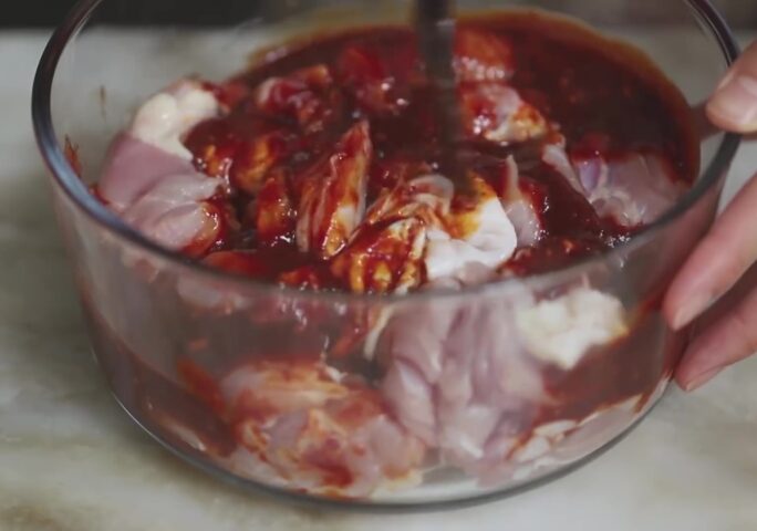 Remove the skin on the chicken meat, marinate in milk for about 30 minutes, wash in cold water, and cut into bite-sized pieces. In a bowl, mix the ingredients for spice and marinate the chicken for another 30 minutes.