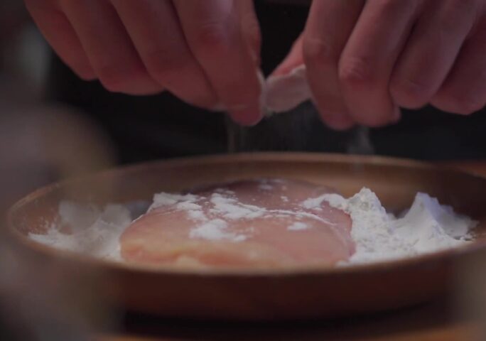 Pound your chicken breast to 1/2” thickness. Season with sea salt and pepper on both sides. Heat a large skillet over medium/medium-high heat. In a shallow bowl, mix together the tapioca flour for dredging.