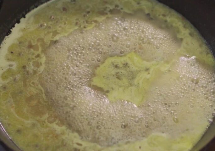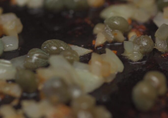 Lower the heat to medium-low and add the remaining ghee. Add the garlic, onions, and capers, cook for a couple of minutes until the onion is translucent and slightly brown on the edges.