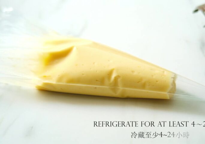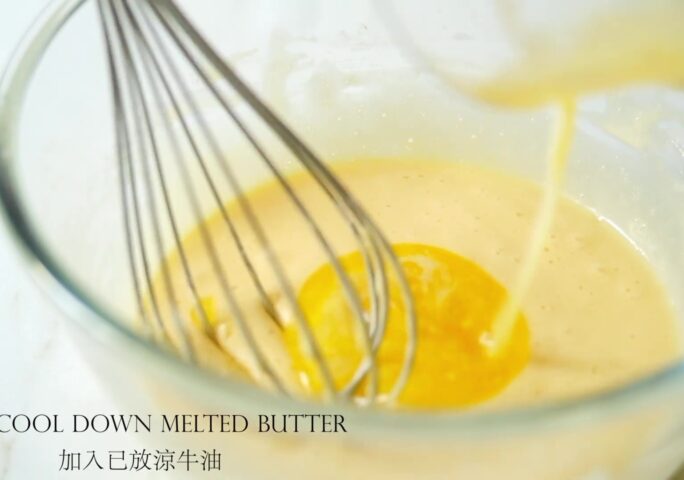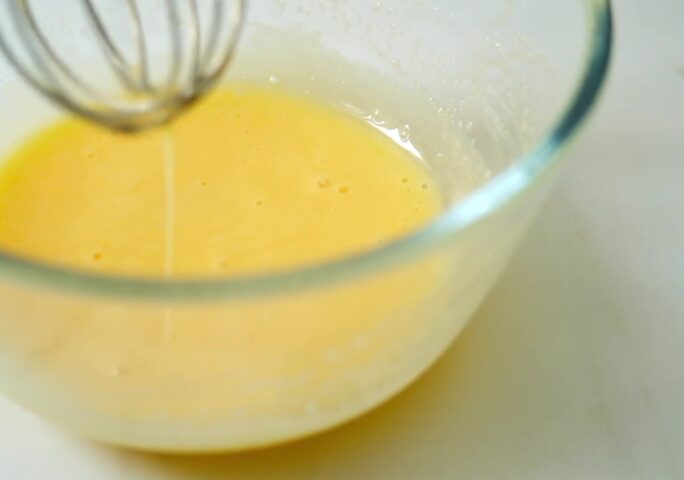 When the butter is completely melted, let cool, and set aside. Beat the eggs until light white, add sugar, and then add fresh milk.