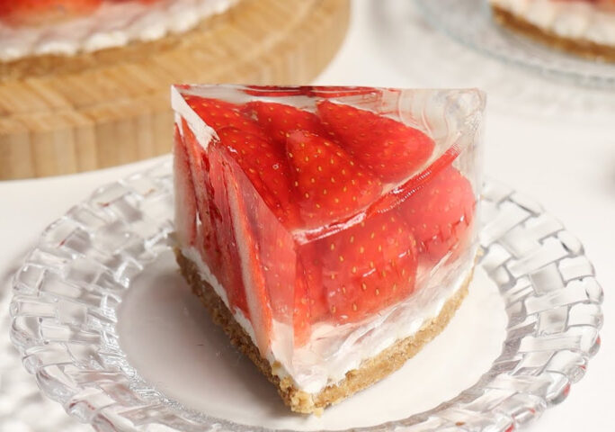 This sparkling strawberry jelly tart is a fresh and light dessert with a little effort only. This no-bake cake is easy to prepare and brings you the flavor of spring. Try and enjoy!
