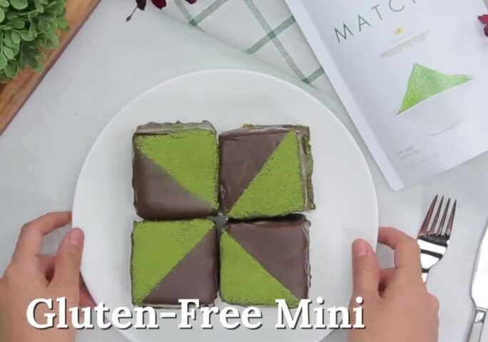 Cut off the four sides to create a square cake. Then cut this into four equal squares.