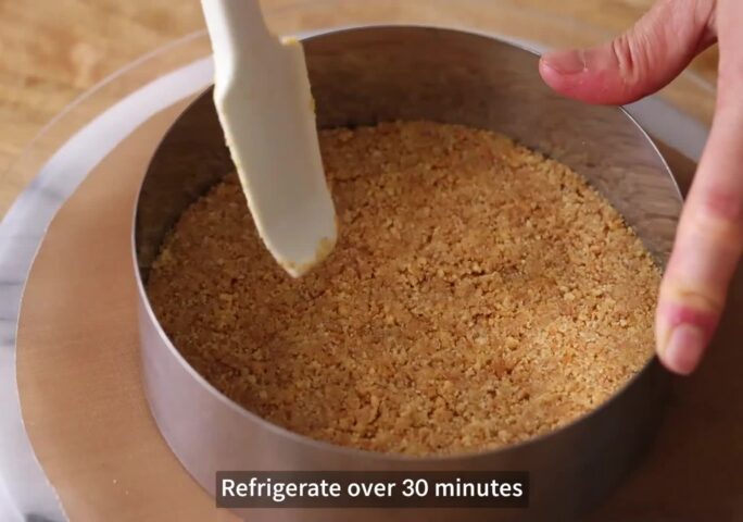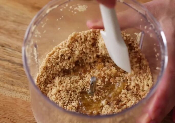 Blitz wheat biscuits into fine crumbs in a food processor. Add butter and mix until combined.