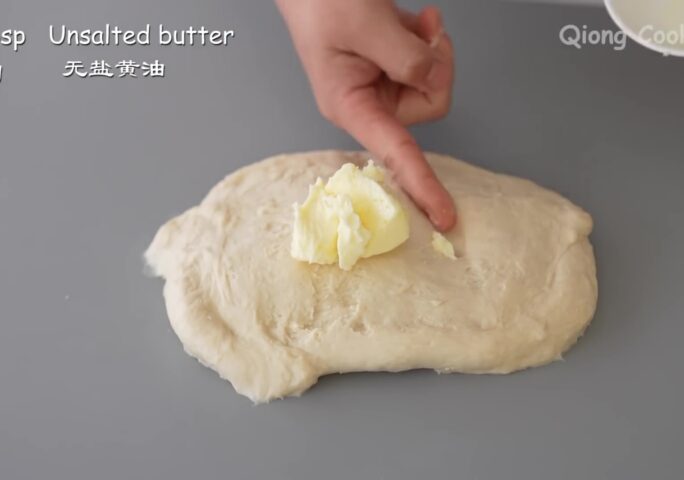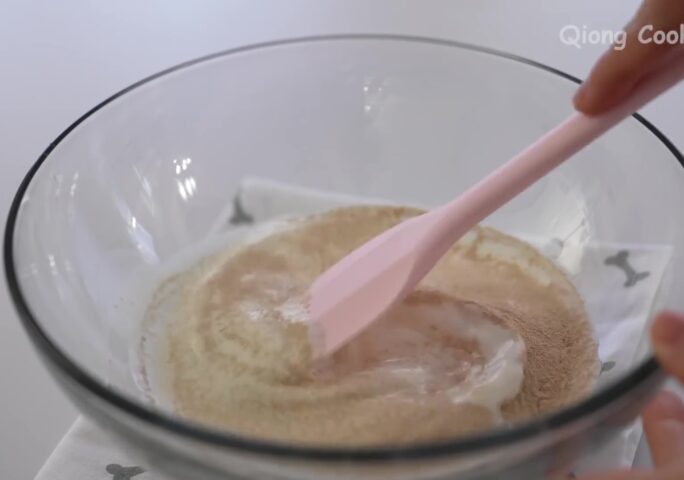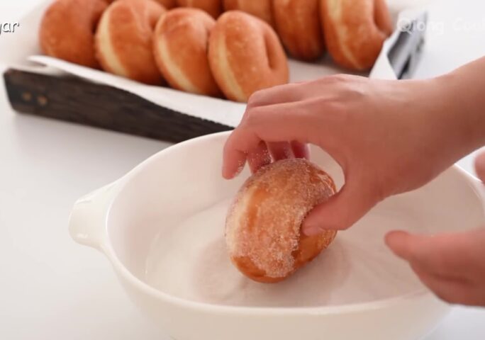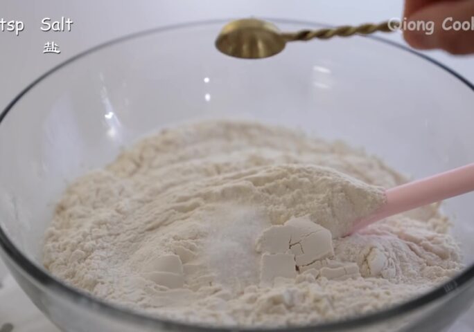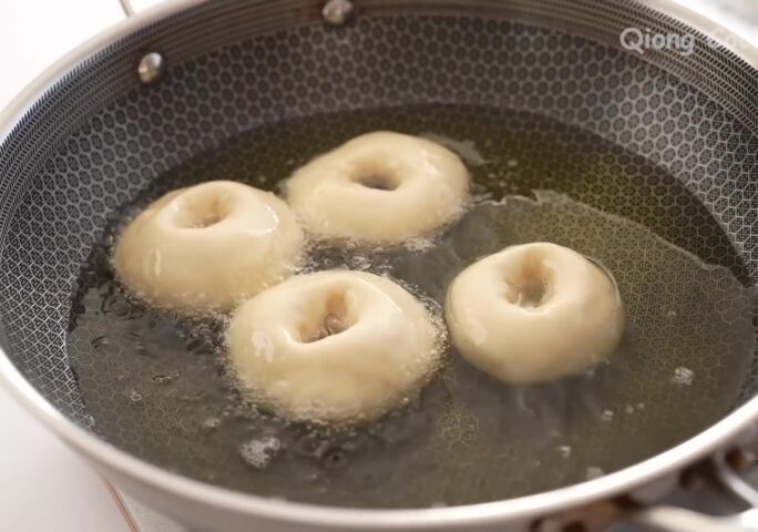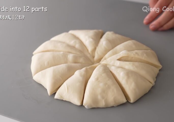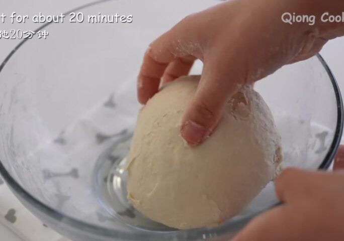Take out one dough and knead it. Knead all 12 parts of the dough. Starting with the first kneaded dough, pinch a hole in the middle of the dough with your finger, then pull the hole bigger. Put two fingers in the middle and turn them around, so the hole becomes bigger quickly.