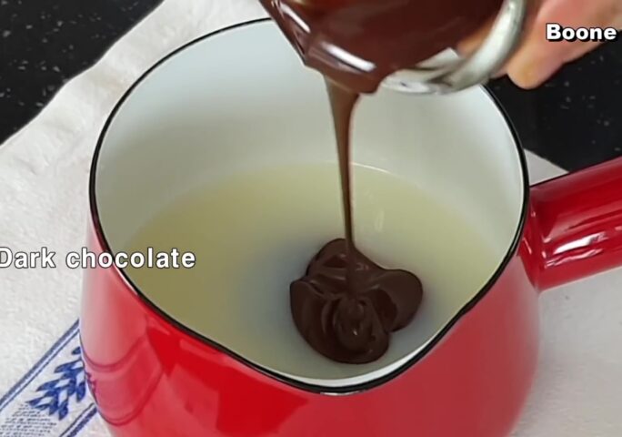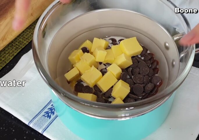 Add dark chocolate and unsalted butter into a bowl and add the cocoa mixture. Put it over hot water and melt the chocolate.