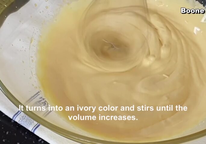 Add yolk, sugar, and vanilla extract into a bowl and whisk it. It turns into an ivory color and stirs until the volume increases.