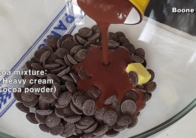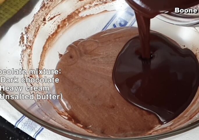 Put dark chocolate, heavy cream and unsalted butter into a bowl and melt it over hot water.
