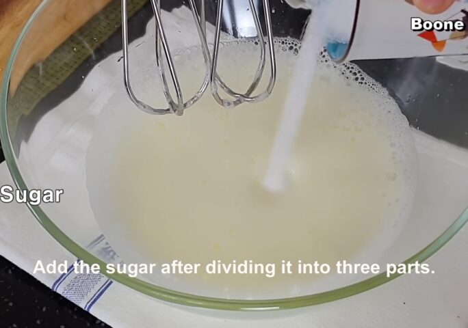 Whip the egg whites with a hand mixer. Add sugar in 3 batches and whip. Whisk for 2 minutes at low speed.