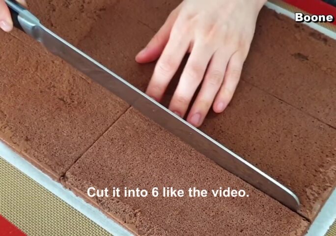 Take out the dough from the oven. Cut the edges. Cut into 6 equal pieces.