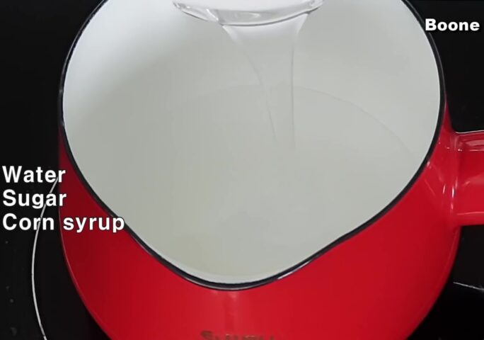 Mix water, sugar, and corn syrup and heat. Syrup temperature 217.4 °F/103 °C.