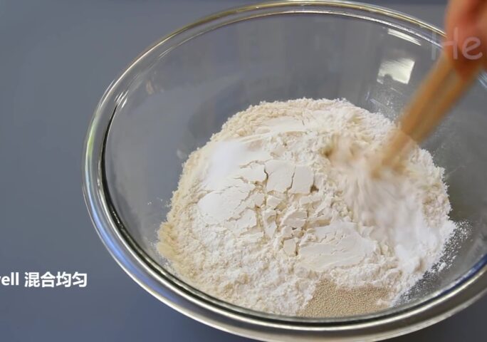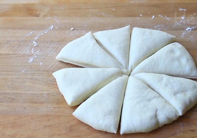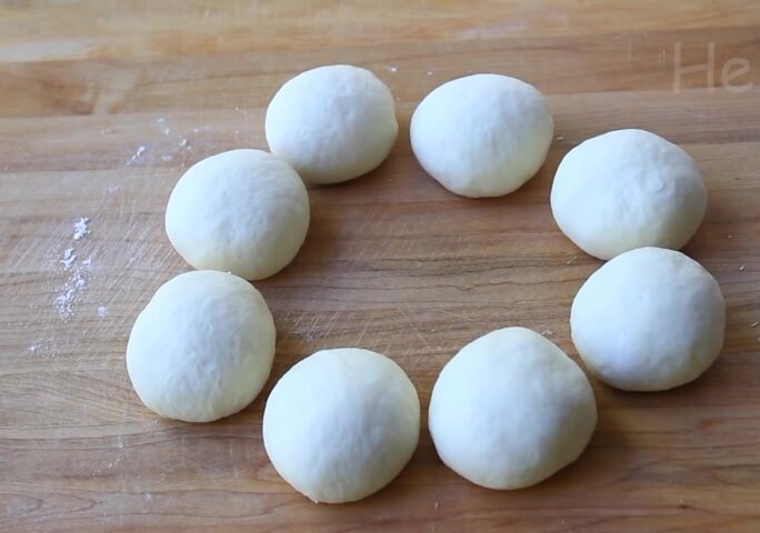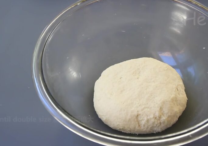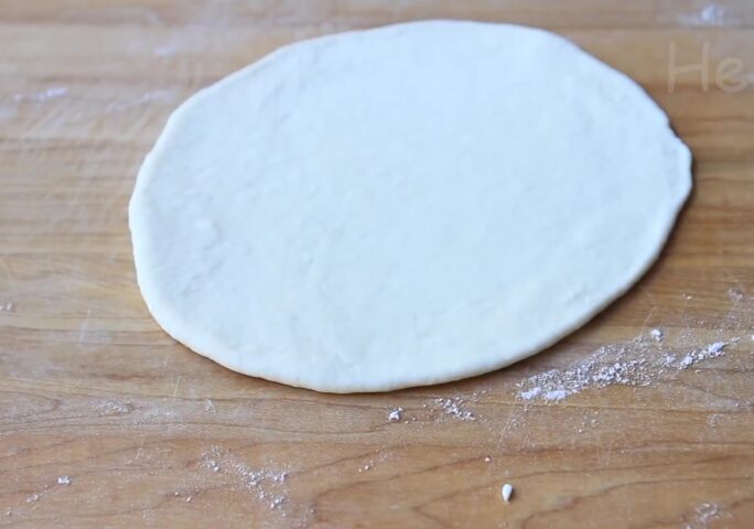 After about 1.5 hours. Sprinkle some dry flour, then deflate the air bubbles. Move the dough aboard. Flatten the dough into a circle.
