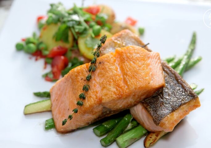 Whip up an impressive meal with this easy-to-follow salmon and spicy potato salad recipe. Salmon fillets are pan-seared until the skin is crispy, while the inside remains tender and juicy. Pair it with a side of Southeast Asian-inspired potato salad, and enjoy a little spice with every appetizing bite.