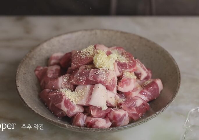 Cut the pork into bite-sized pieces and marinate for about 15 minutes.
