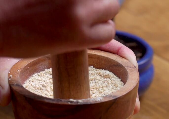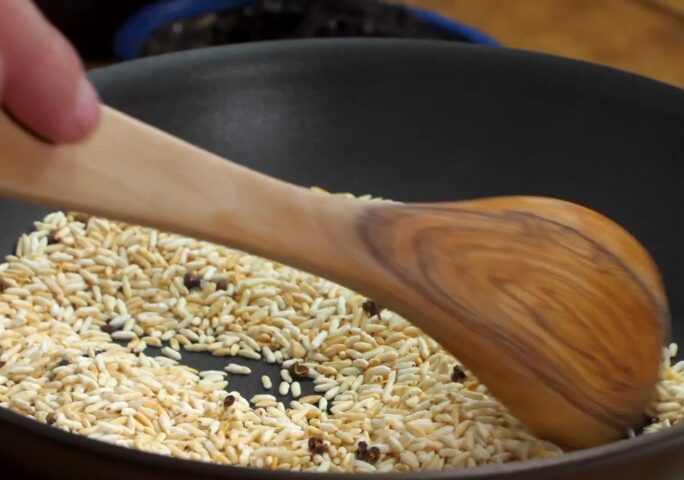 Place Sichuan peppercorns and 85g rice in a skillet over medium heat. Stir fry until golden brown.