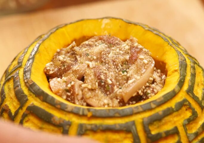 Steamed pork that is placed inside a pumpkin for a great flavor profile. This stuffed recipe is widely popular in the Sichuan province in China. An elegant way to serve a pork dish.