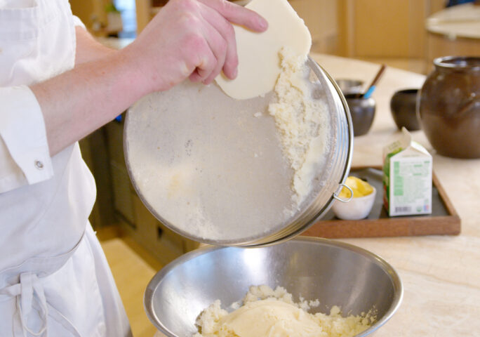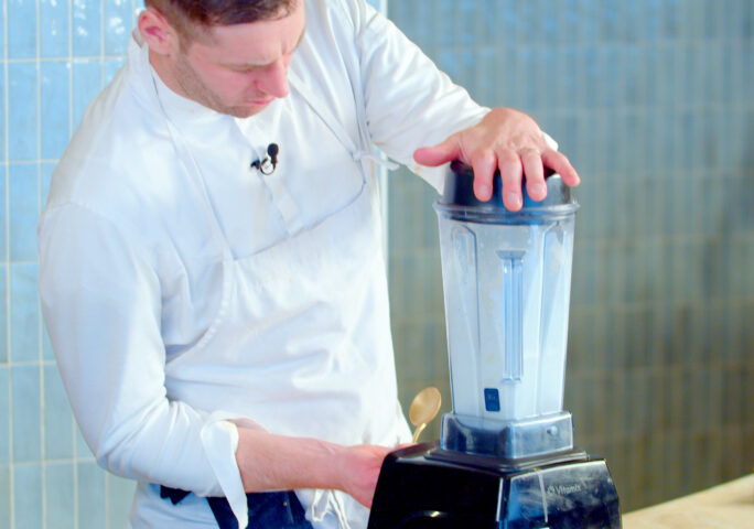 Add milk to the finely chopped radish to make a purée and velouté sauce. The purée is made by blending the velouté sauce until smooth.