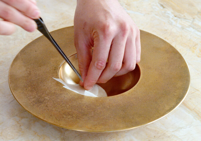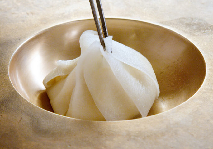 Spread radish purée on the sliced radish, then gently lift and shape into a flower.