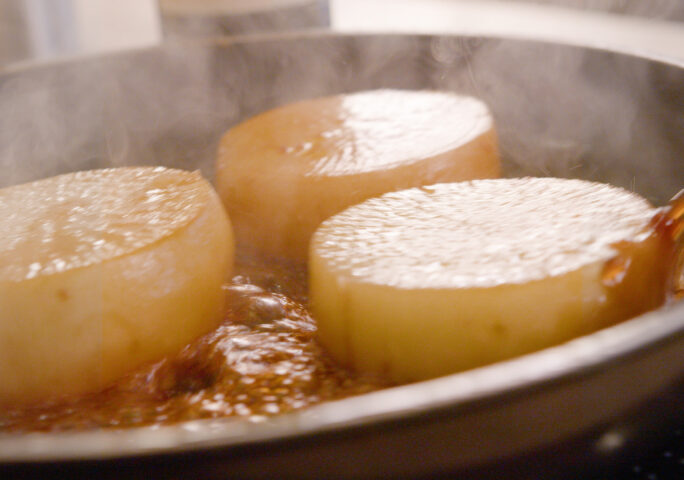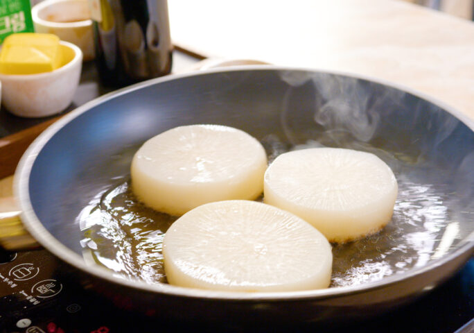 Pre-cook for tenderness: Score one side of each piece with a crosshatch pattern about 5 mm deep. Fill a large pot with enough water to submerge the radish and add a pinch of salt. Add the radish before heating so both heat up together. Once boiling, reduce heat and simmer for 30 minutes until fork-tender.