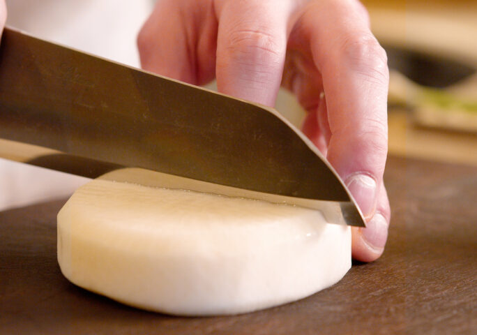 Cut the “steaks”: Cut the radish into 3.5 cm thick round slices. (Use the center part of the radish for larger pieces.) Peel each piece using a vegetable peeler. Trim the edges neatly.