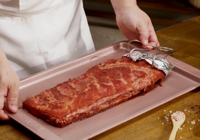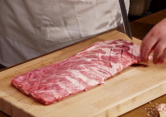 Cut the pork ribs. Start from one corner at 45 degrees, cut it to 1/3 depth, cut it all the way to the end, and then switch to another 45-degree oblique knife from the other corner. Crosscut.