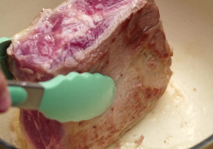 In a medium cast iron pot over medium heat, pour in oil. When oil is hot, turn on high heat and fry the pork for 3-4 minutes on all sides until the surface is browned.
