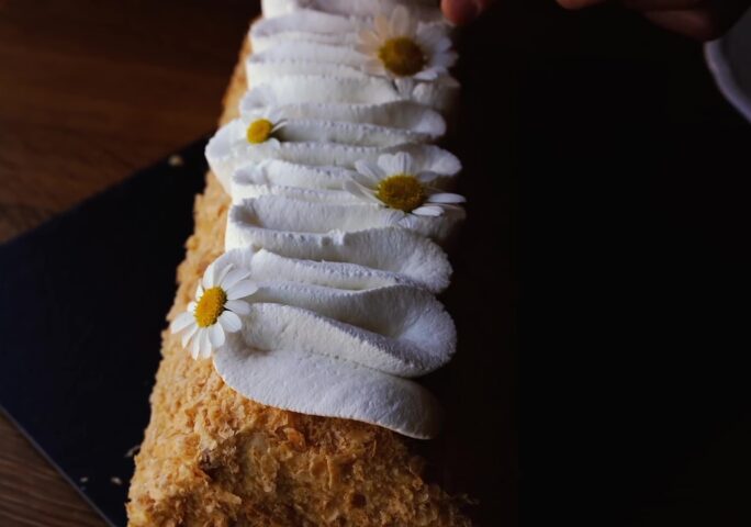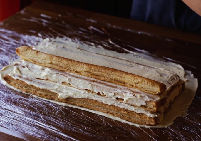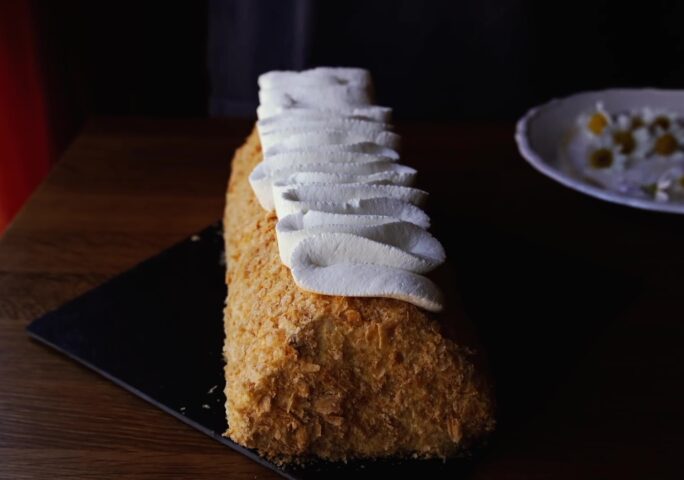 If you are a lover of Russian gastronomy, you can’t miss this different format of the traditional Russian Napoleon Cake. This version is very easy to make and looks like a log. It is usually made tall, with at least eight tiers (and sometimes more than 20) of alternating layers of puff pastry and custard. Inspired by the French mille-feuille, it has become a Russian national dish.