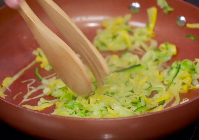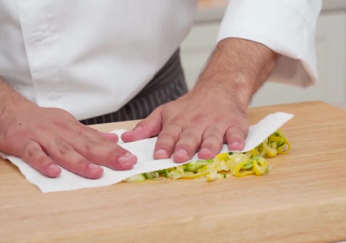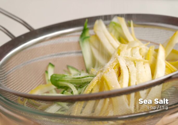 Pass 2 zucchinis through a spiralizer or cut them into very thin strips using a vegetable peeler and then cut into very thin julienne. Season them generously with salt to extract the water and leave them on a strainer for 15 to 30 minutes to let the moisture come out.