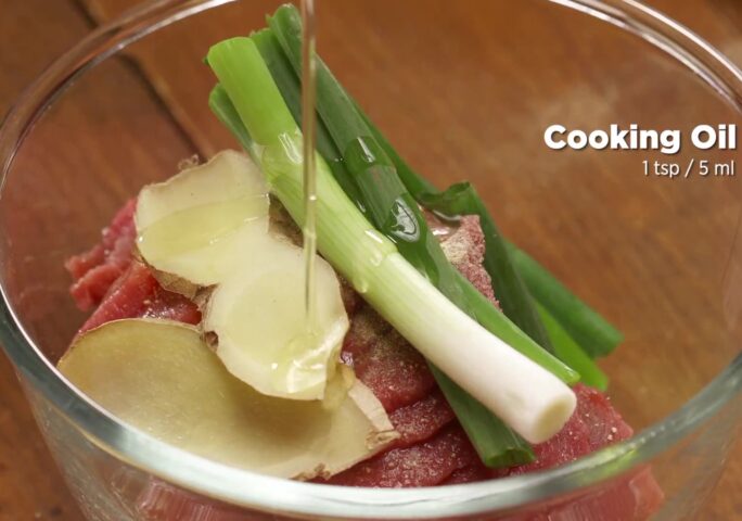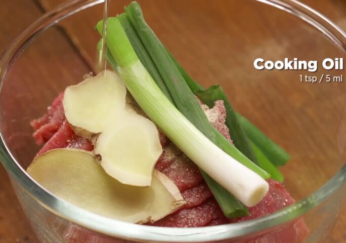 Season the beef sliced with salt, half of Shaoxing wine, and ground white pepper; mix well and add slices of green onions and ginger.