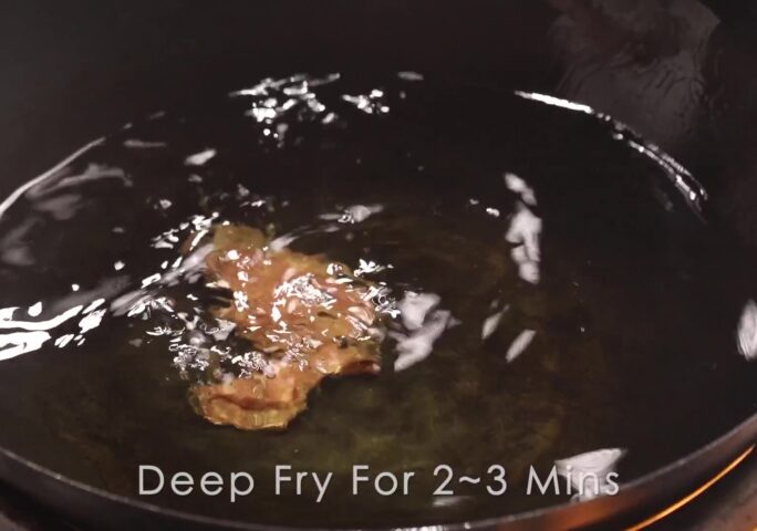 Strain the beef slices and refry for a seconds time on very high heat until crisp for 30 seconds. Strain and transfer to a serving plate. Remove the oil.
