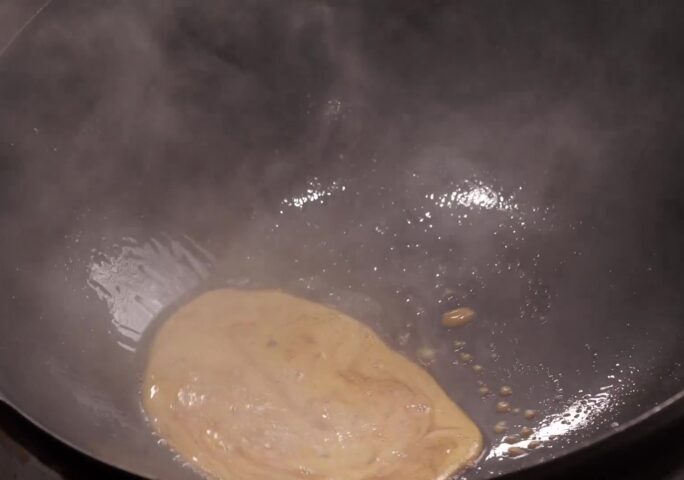 Place a quarter cup of vegetable oil in the same wok and heat. Sprinkle the granulated sugar until it becomes caramel.