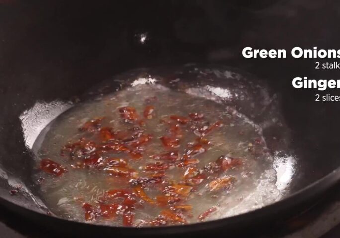 In the same wok, pour 2 tbsp. vegetable oil and add dried cayenne pepper, Sichuan peppercorn, and salted chicken stock.