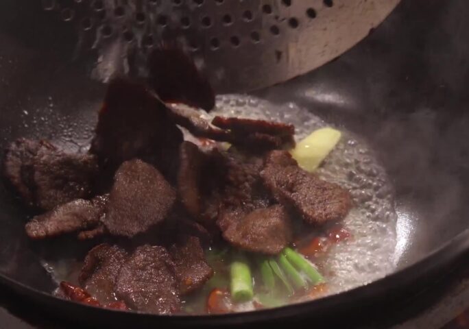 Place 1 1/2 qt. oil into a heated wok and fry the beef slices for 3 minutes.
