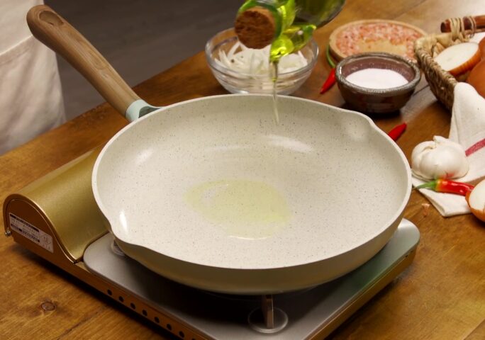 Pour the oil into a heated skillet over medium heat.