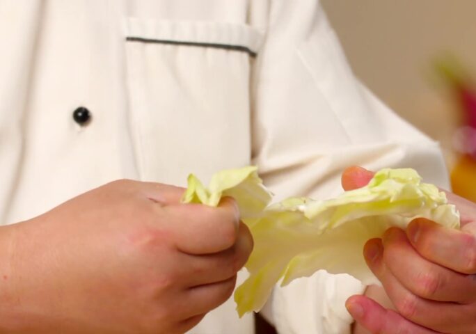 Halve the cabbage with a knife and remove the core; tear the leaves into 3-inch wide pieces with hand, leaving the stems out and only keep the tender leaves.