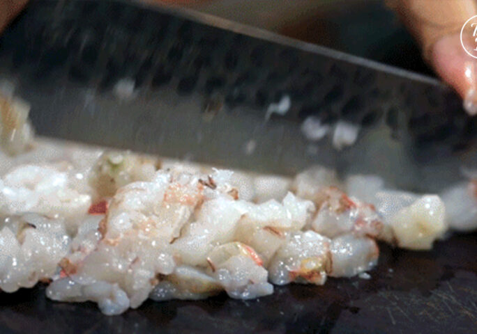 Making the stuffing: Mince the prawns finely and put them into a bowl. Add ginger,