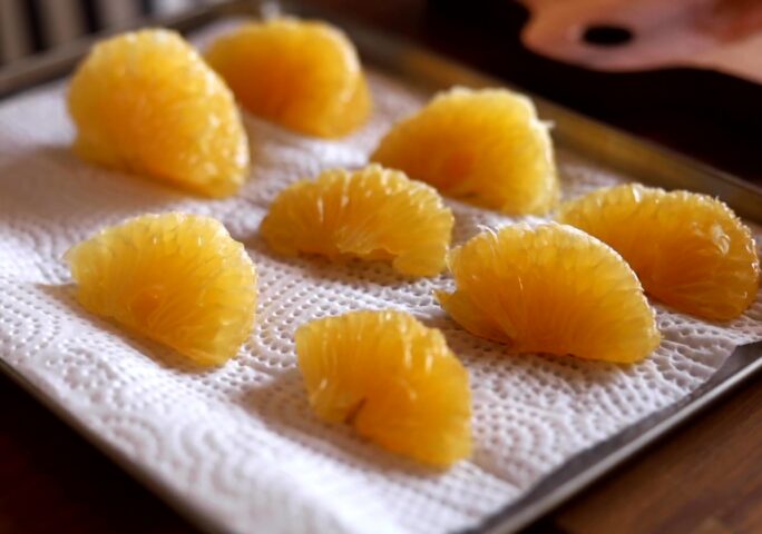 Peel off the sweet summer orange. Take out the pulp. If the pulp is thick, we should slice it in half. Put them on paper to drain off the excess water.