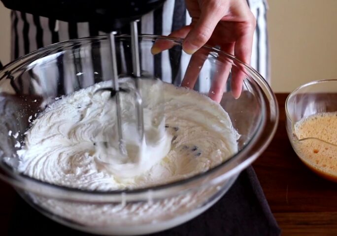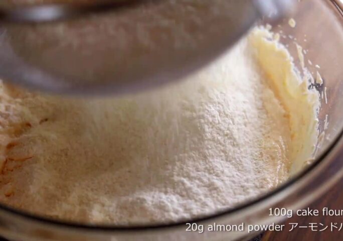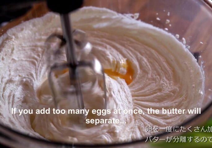 Make the butter dough. Mix the butter and sugar with a spatula. When the mixture is creamy, switch to a hand mixer. Beat the butter until it becomes fluffy and white.