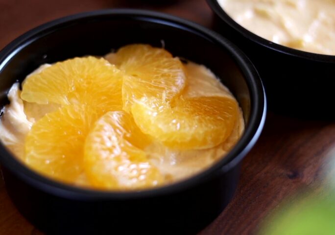 Put the dough in. Put as many sweet summer oranges as you like on top of the dough.