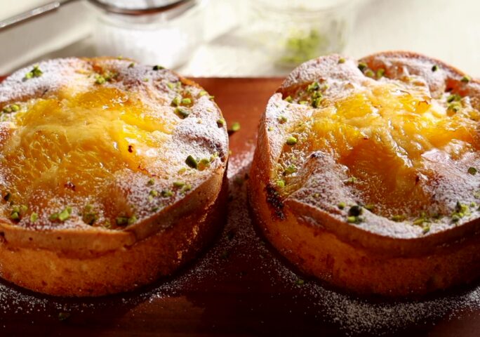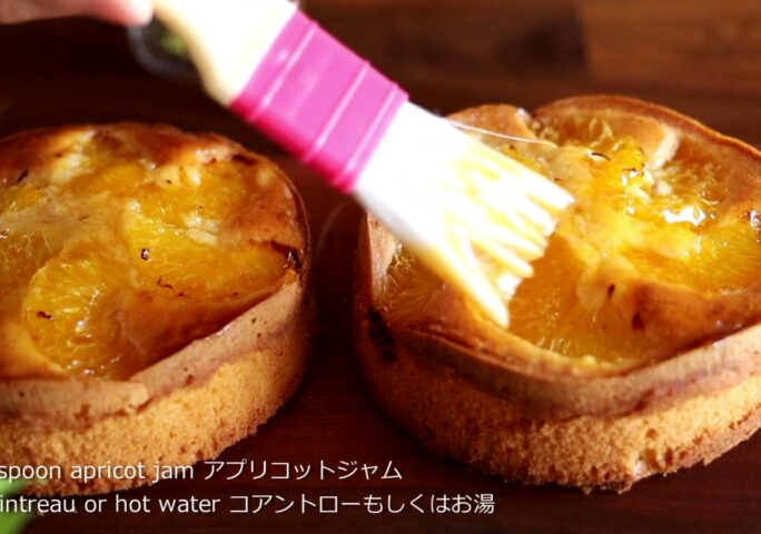 Warm the apricot jam and Cointreau in the microwave for 15 seconds and spread it on the cake.