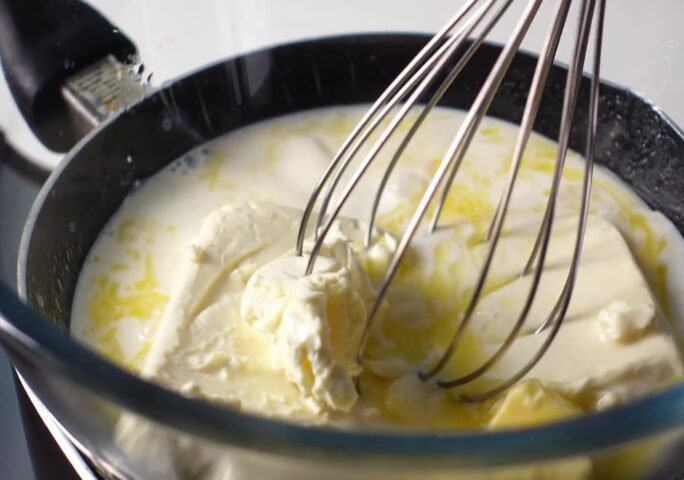 Put cream cheese, butter, milk into a bowl, then put on top of hot water.