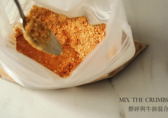Crush the biscuits. Add melted butter and mix.