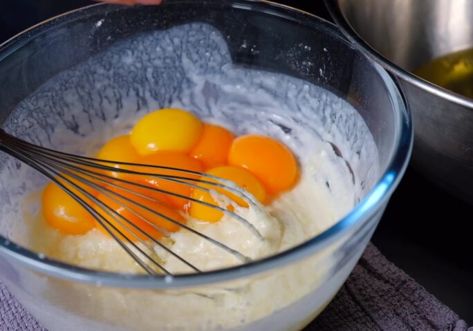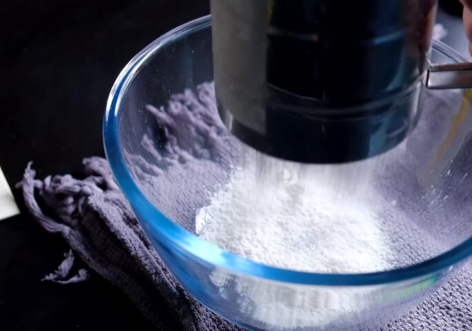 Sift cake flour, cornflour, and prepare eight eggs. Preheat the oven up to 329 °F/165 °C and down to 347 °F/175 °C.