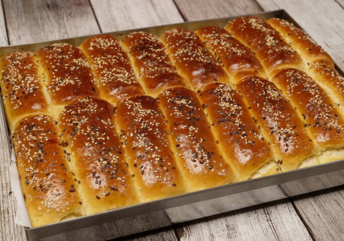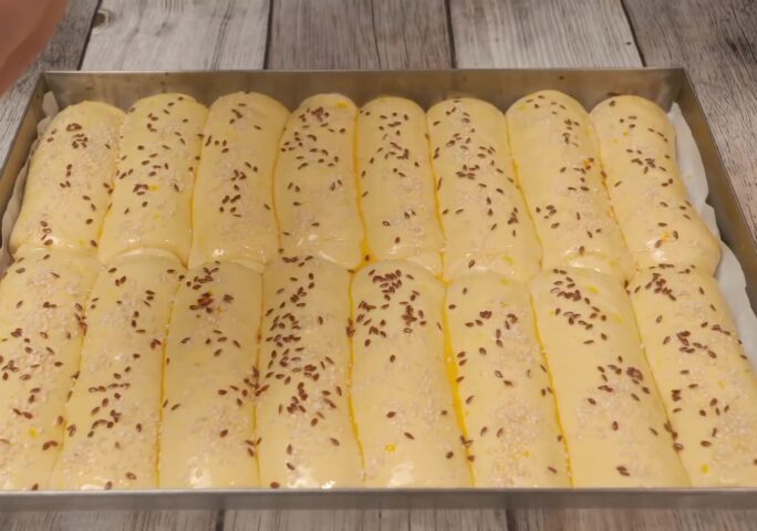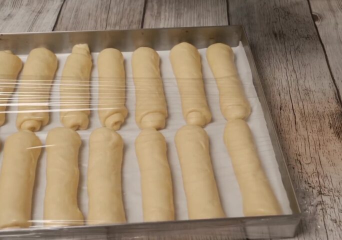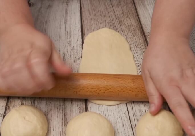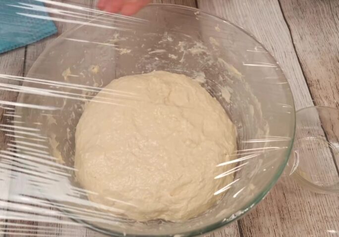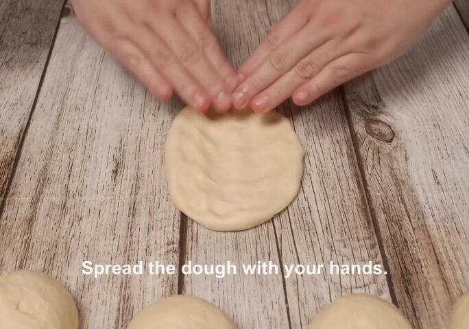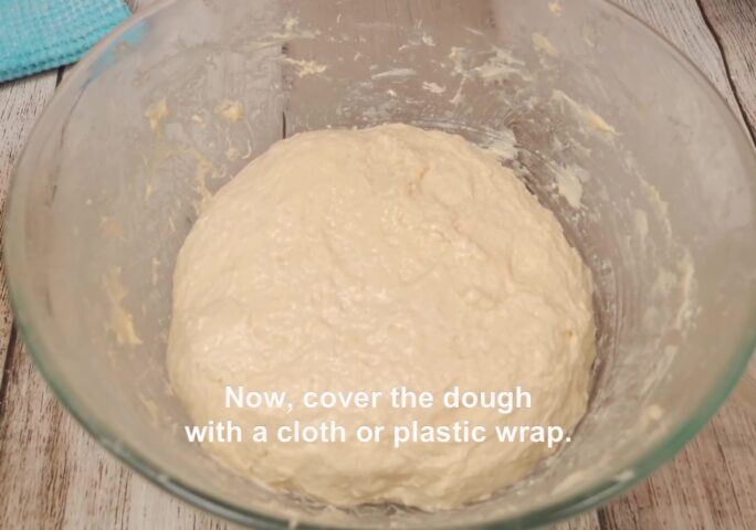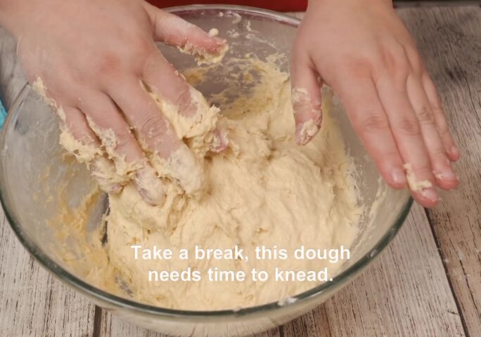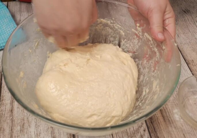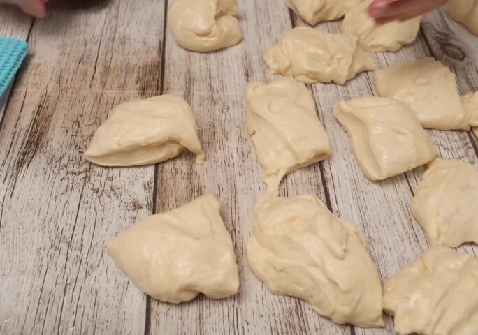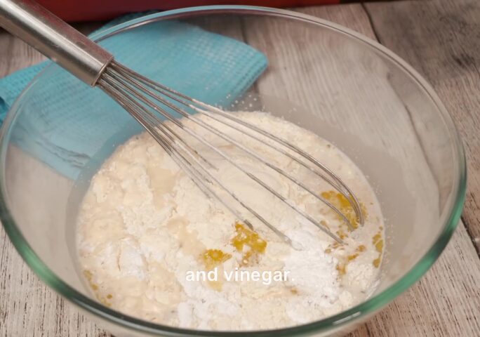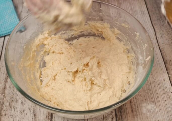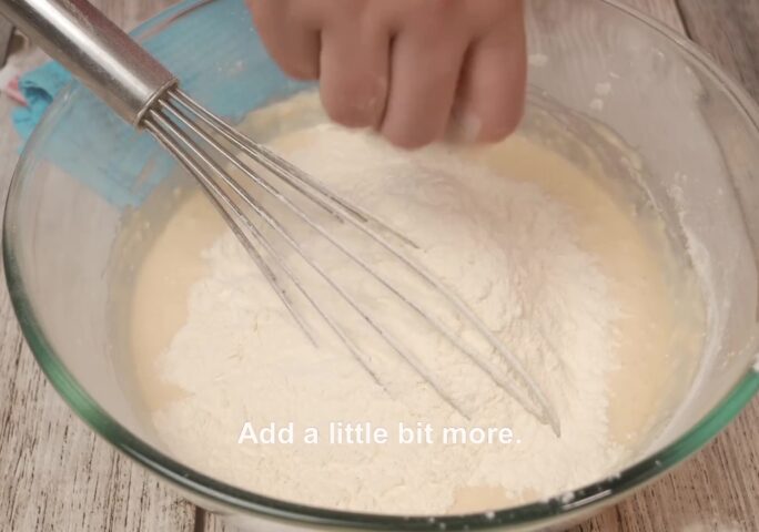 In a medium bowl, add sugar and yeast in warm milk, and stir to mix well. Then add a little flour, egg yolks and egg whites, melted butter (leave one tablespoon), baking powder, and vinegar and mix well again.