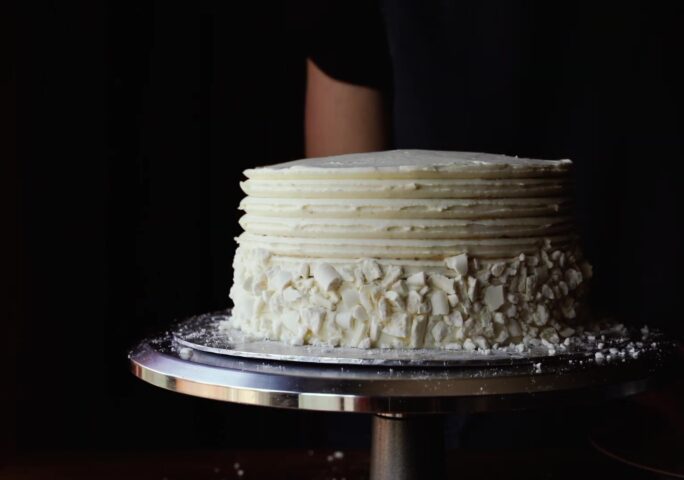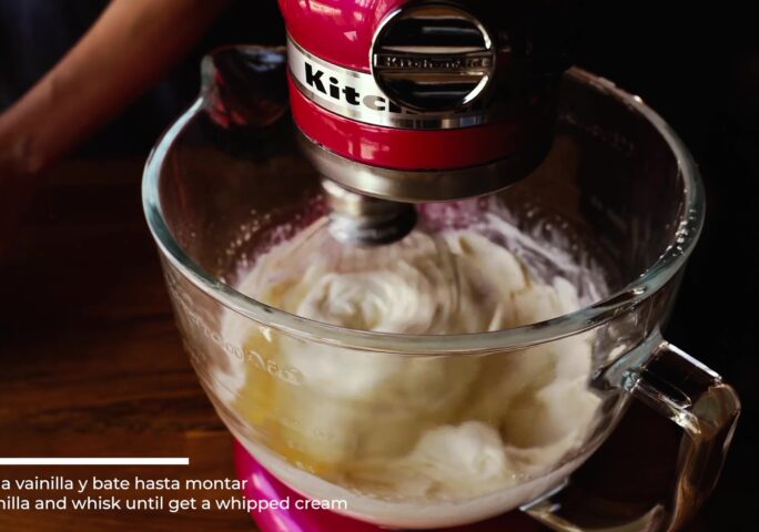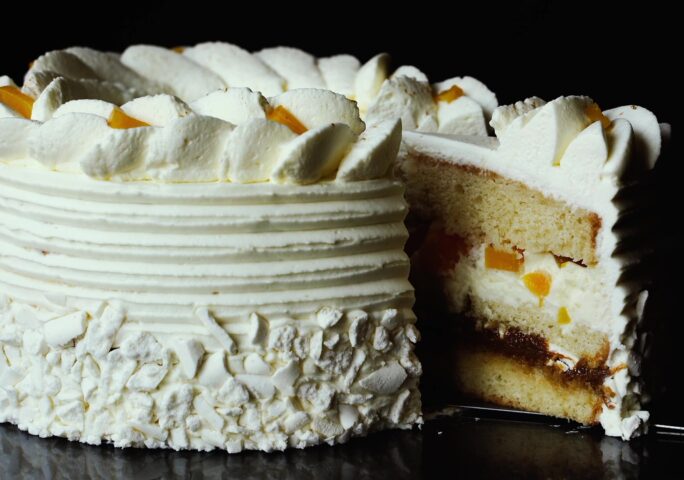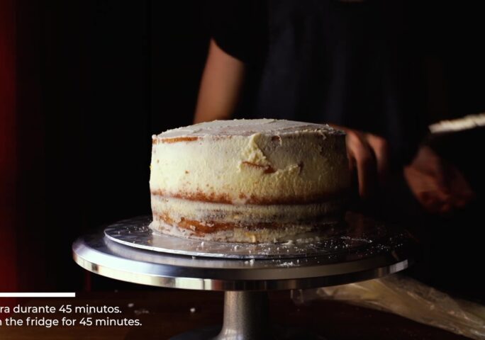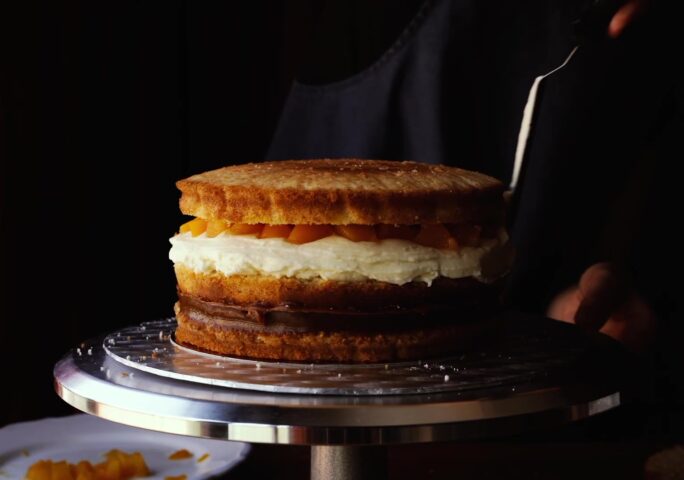 The cake consists of layers of syrupy sponge cake in which two fillings alternate; dulce de leche with chopped dry meringue and a cream and mascarpone cream (originally Chantilly) accompanied by peach in syrup.