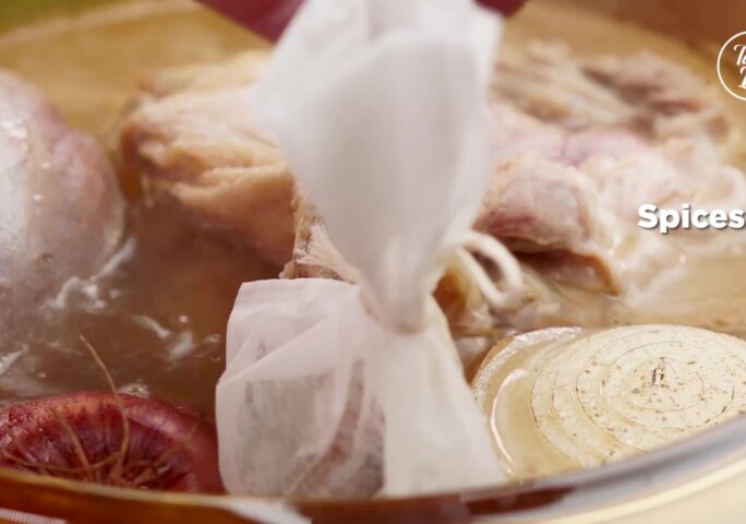 Put the following spices in a small cotton spice bag: bay leaves, tsaoko, cinnamon stick, star anise, fennel, cloves, coriander seeds, and white peppers.